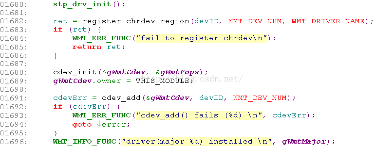 第1682~1696行,注册mtk_stp_wmt字符设备,mknod /dev/stpwmt c 190 0;即其设备为/dev/stpwmt