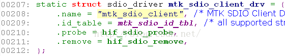 sdio总线上驱动与设备匹配时通过mtk_sdio_id_tbl来配对。