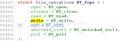 注册mtk_stp_BT_chrdev字符设备,而BT_DEV_MAJOR为192,在init.project.rc: mknod /dev/stpbt c 192 0;故该字符设备为/dev/stpbt,对应的设备操作如下: