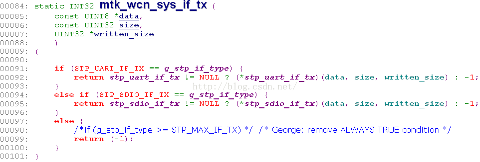 sys_if_tx函数指针在mtk_wcn_stp_init函数中赋值,从stp_drv_init函数中可得知对应的函数为mtk_wcn_sys_if_tx,其代码如下,