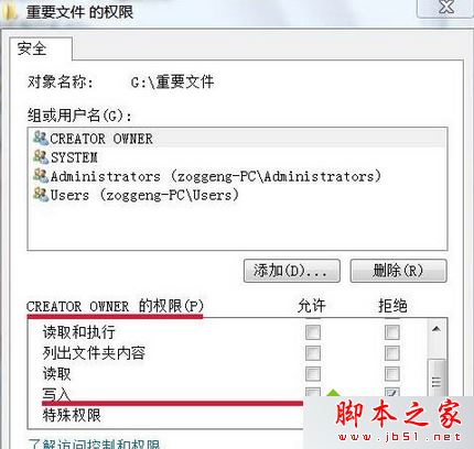 4、在组和用户名中选择你要限制的用户名,如Administrator 或users,然后在下面的权限栏中找到写入,并在写入的拒绝小框中打上勾,然后点击:确定,回到重要文件属性窗口也点击:确定;