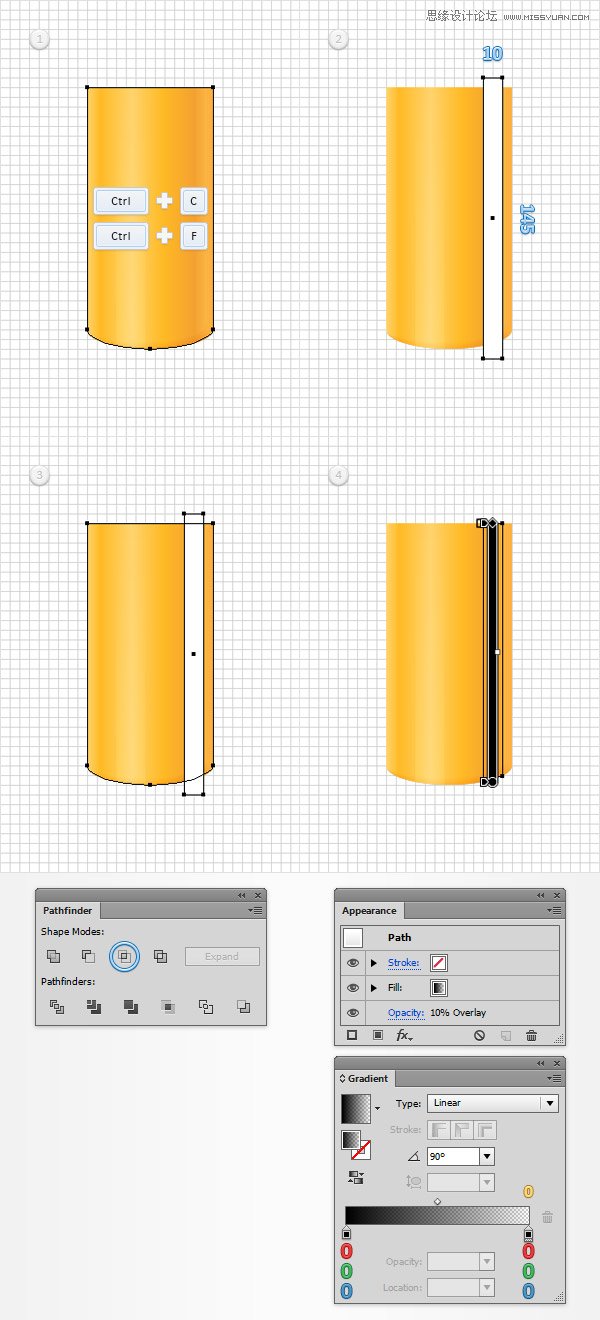 随着该步骤开始时所作的副本选择这个新的矩形,然后单击相交按钮,从探路者面板。填补由此产生的形状如下图所示的线性渐变,降低其不透明度为10% ,改变混合模式为叠加。不要忘了,从黄色零梯度图像表示不透明度百分比。