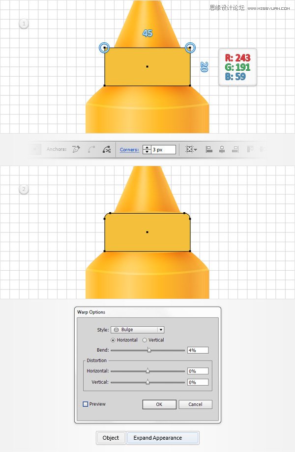 围绕这一新的形状的顶部,并切换到直接选择工具(A) 。选择这两个锚点,移动到控制面板,专注于转角部分,只需输入3px的在白盒。请确保您的黄色形状仍处于选中状态,然后转到效果>扭曲>猛涨。进入如下图所示的属性,单击OK(确定),然后转到对象>扩展外观。