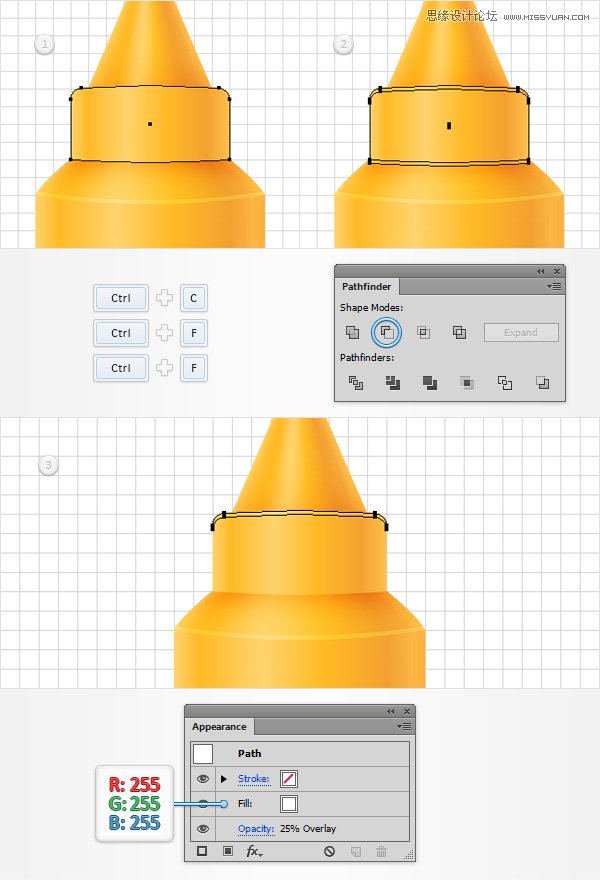 重新选择在这个步骤做两个拷贝,然后单击负接待按钮,从探路者面板。填补由此产生的形状,白色,降低其不透明度为25% ,改变混合模式为叠加。