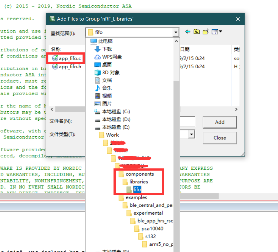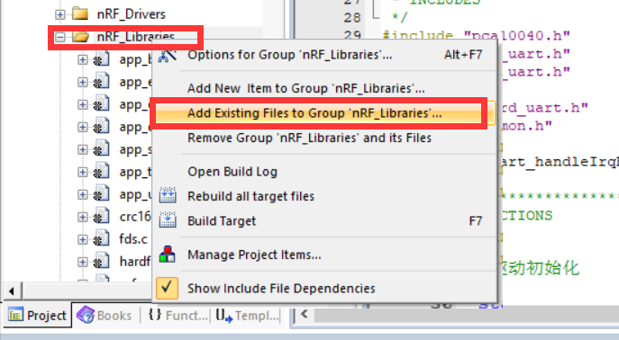 在 nRF_Drivers 文件夹和 nRF_Libraries 文件夹确认以下组件库是否存在,不存在则添加。
