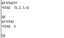 AT+CPAS=?:查询模块支持的活动状态列表。
