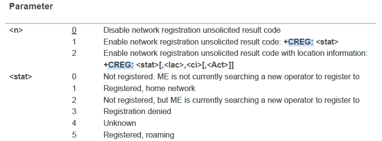 - AT+CREG 网络注册状态