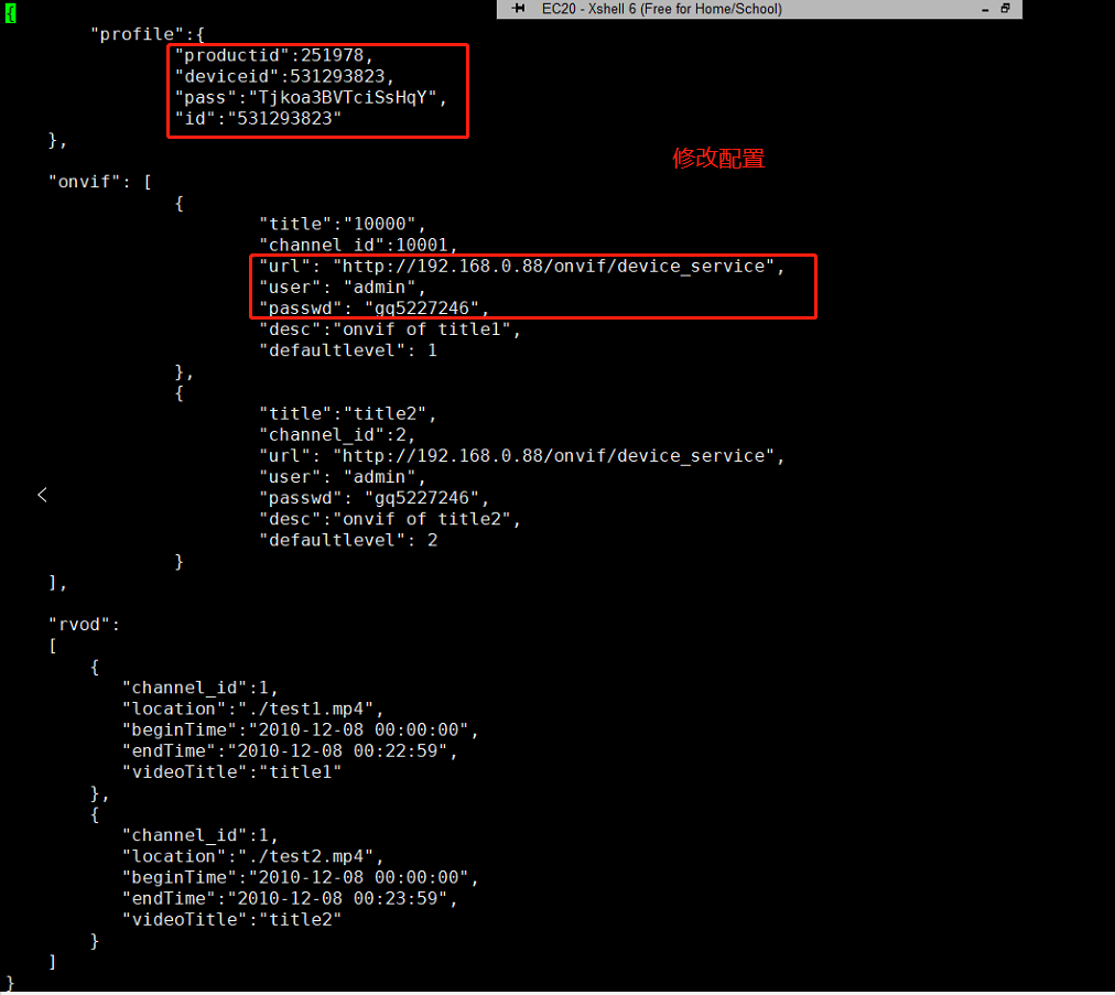 七.根据onenet平台的建立的设备信息修改config.json ,(可以参考onenet文档建立视频服务设备)