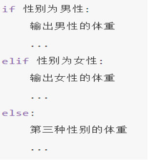 当 “性别为男性” 满足时,执行 “输出男性的体重”的相关代码 当 “性别为男性” 不满足时,如果 “性别为女性”满足,则执行 “输出女性的体重”的相关代码 当 “性别为男性” 不满足,“性别为女性”也不满足,那么久默认执行else后面的代码,即 “第三种性别的体重”相关代码