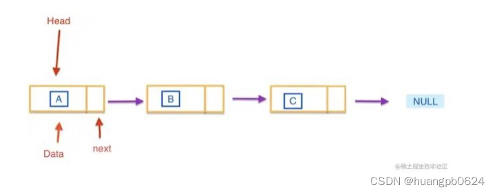 多个元素组成的列表,元素存储不连续,通过 next 指针来链接, 最底层为 null。