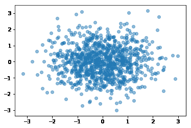这里使用numpy包的random函数随机生成1000组数据,然后通过scatter函数绘制了散点图。