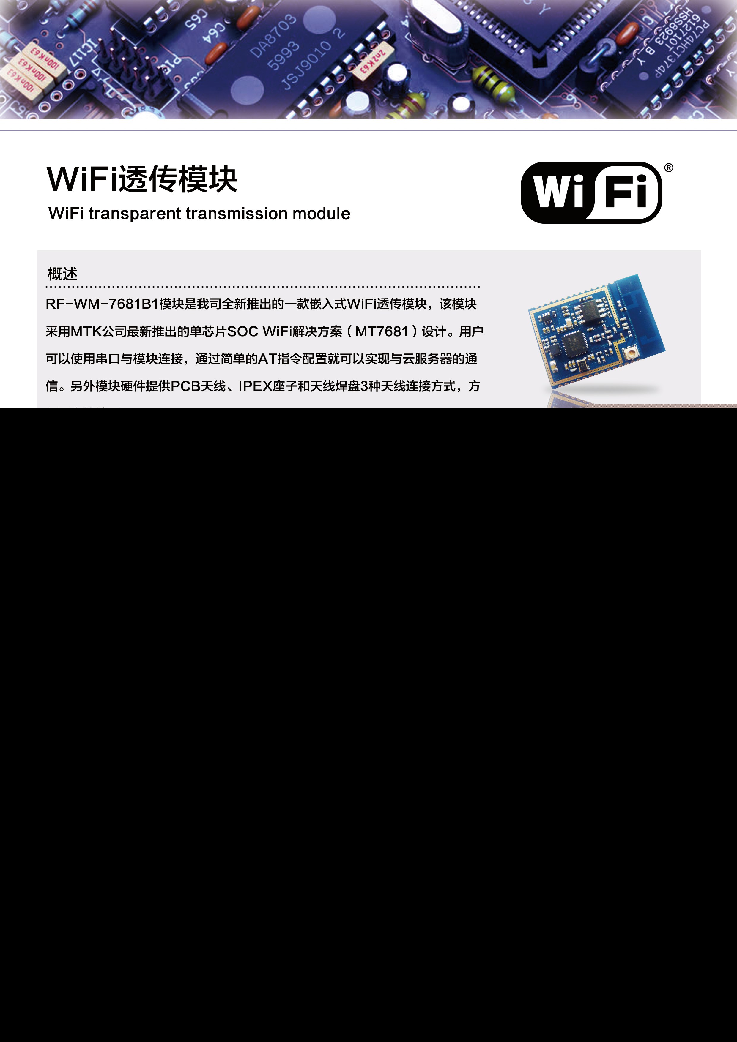 RF-WM-7681B1 模块是我司全新推出的一款嵌入式 Wi-Fi 透传模块,该模块采用 MTK 公司最新推出的单芯片 SOCWi-Fi 解决方案(MT7681)设计,内置 32 位 MCU, 提供 UART、GPIO 通信接口;模块支持 802.11b/g/n 无线标准,实现 TCP/IP 协议,可 以实现与云的通信;支持 Station,AP 模式。另外模块硬件还包含了 PCB 天线、IPEX 座子和天线焊盘 3 种天线方式。 RF-WM-7681B1 模块具有两种操作模式:AT 命令模式和串口数据透传模式;AT 命令模式可以通过串口 AT 命令对模块进行各种参数配置,通过简单的 AT 命令配置后,数据透传模式可以实现把串口数据透明传输到网络指定的设备。