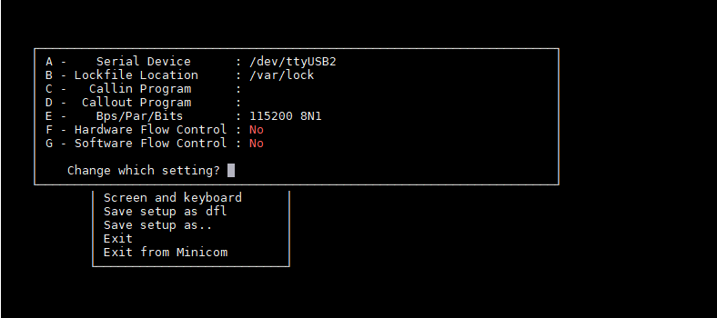 在开发板中输入“minicom -s”打开配置界面,选中“serial port setup”,配置对应的串口: