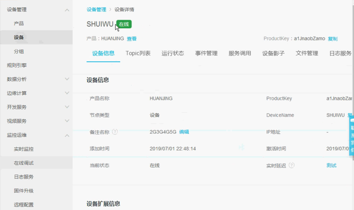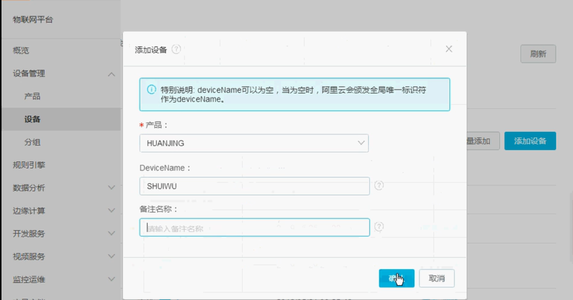 建立添加设备,选择我们产品,添加设备,点击设备 属于环境这个产品,环境比如说是水务管理,