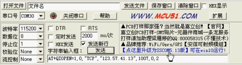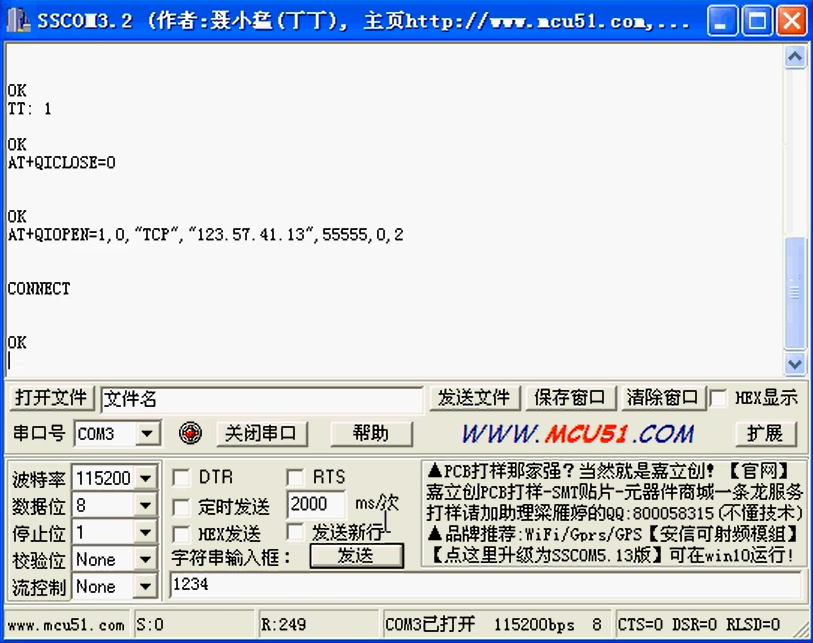 连接上之后就可以发送数据了,发1234 这样的话,这个板子就跟我们的服务器建立了一个叫tcp的一个连接 他用的是第一个通道 AT+QIOPEN=1 ,0