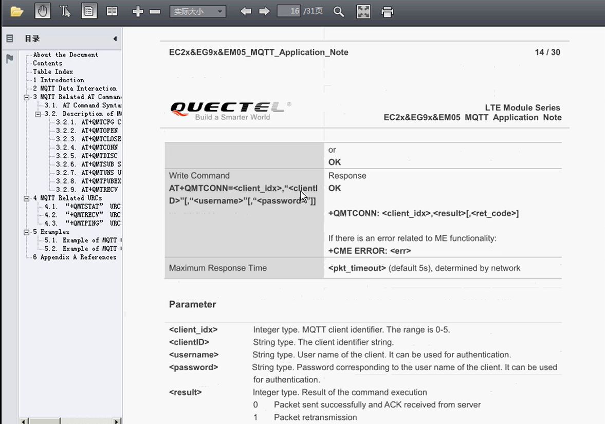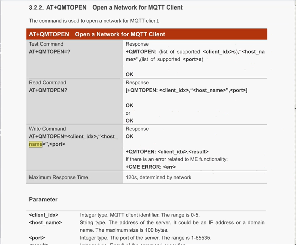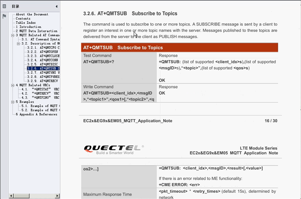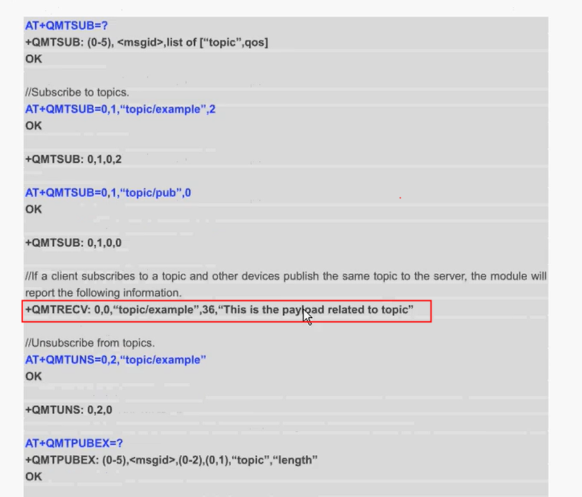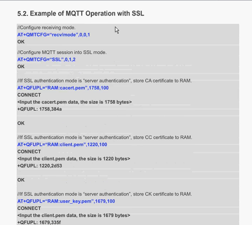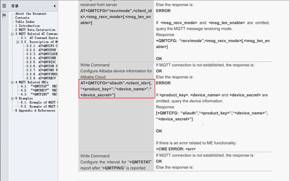 mqtt手册,首先他必须第一步首先发送AT+QMTCFG配置命令,如果这个返回ok就可以,如果他不反回ok 表示你的模块不支持,发的时候要注意,不要多发也不要少发,如果发错的话,他也会返回错误,它里面有什么参数?首先 阿里云的一个版本,当然他有其他的一个命令,发送到比如说自己搭建的阿里云服务器 自己搭建的一个mqtt服务器也可以,有人他在自己的系统里面搭建mqtt服务器也可以发过去,那这里我们用他这个阿里云物联网的服务器 第一个参数表示阿里云 然后他的一个id 也就是 他其实mqtt是基于tcp tcp也有这个ip 所以mqtt也有,然后 产品的key 设备名称, 加密钥,这是第一个命令