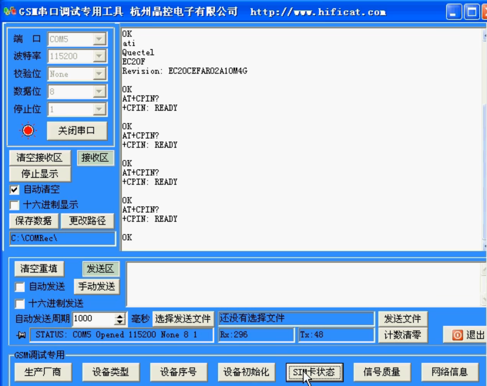 模块上电,等待模块灯的一个闪烁,表示他启动,启动我们开始检测卡状态,信号质量,这个时候质检成功,准备发数据,