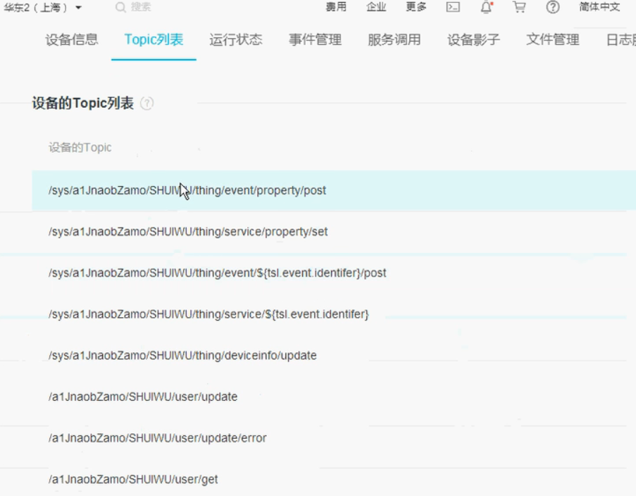 设备topic列表,topic他是 通过接口,比如说通过get方式可以下发数据,可以订阅比如说订阅到SHUIWU/user/get 比如说有数据下发的话,他会通过topic列表来把数据下发下去,比如说设备需要发布数据的时候可以通过第一个topic列表来把数据发上来,比如还有其他的方式 set post 还有其他的订阅方式,还有update更新的一个方式,还有错误的一个更新,错误的一个检测,主要用到的有第一个 上发,和最后一个下发,运行状态,这边有一些数据库,有一些数据,