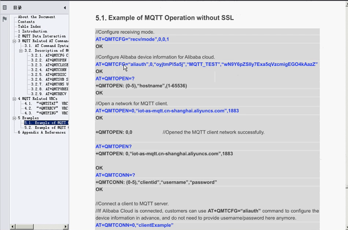 例子,比如说配置命令???? 配置到阿里云aliauth 然后是open QMTCONN连接,