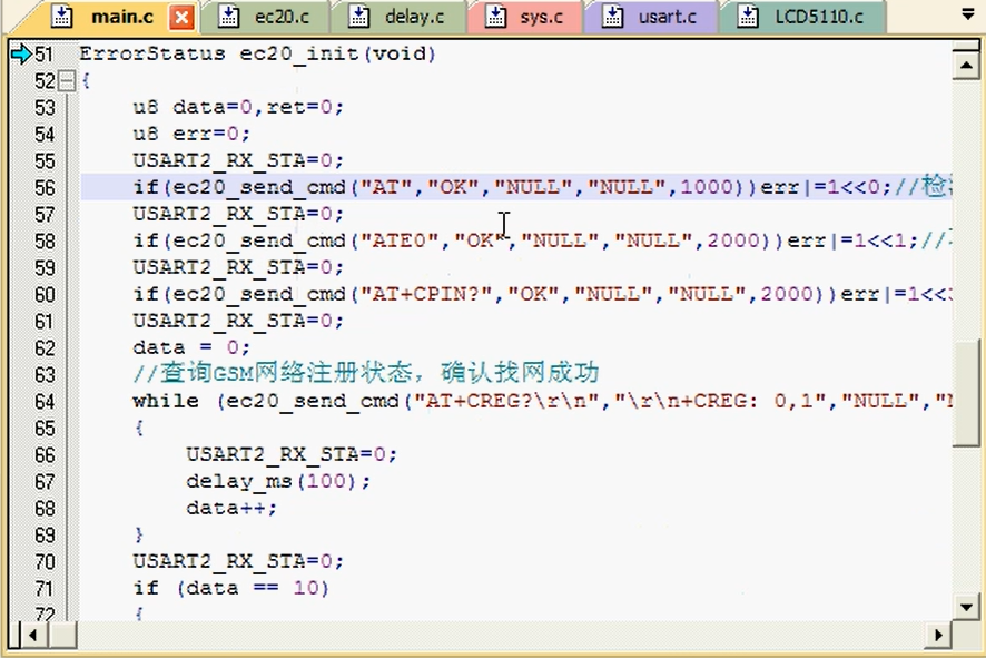 接下来是模块的初始化,模块比如说给他发送AT他返回OK 我们表明连接成功, ATEO关闭回显, 查询卡状态 查询 注册状态,反馈0,1 表明我们确定我们跟基站信息做了一个连接,判断我们查询状态之后 判断激活状态,