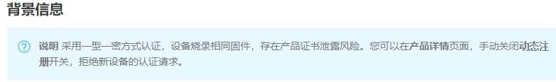 一型一密安全认证方式下,同一产品下所有设备可以烧录相同固件(即烧录ProductKey和ProductSecret)。设备发送激活请求时,物联网平台进行身份确认,认证通过,下发该设备对应的DeviceSecret。