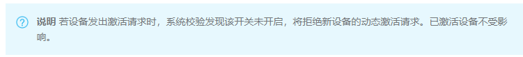 - 在已创建产品的产品详情页面,开启动态注册开关。系统将进行短信验证,以确认是您本人操作。