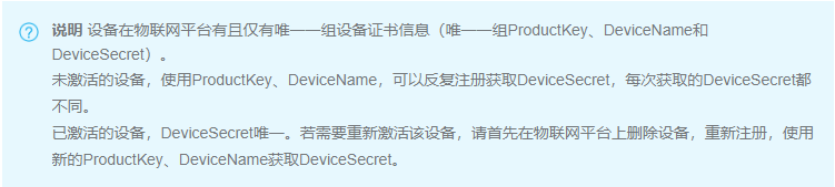 因设备激活时会校验DeviceName,建议您采用可以直接从设备中读取到的ID,如设备的MAC地址、IMEI或SN号等,作为DeviceName使用。