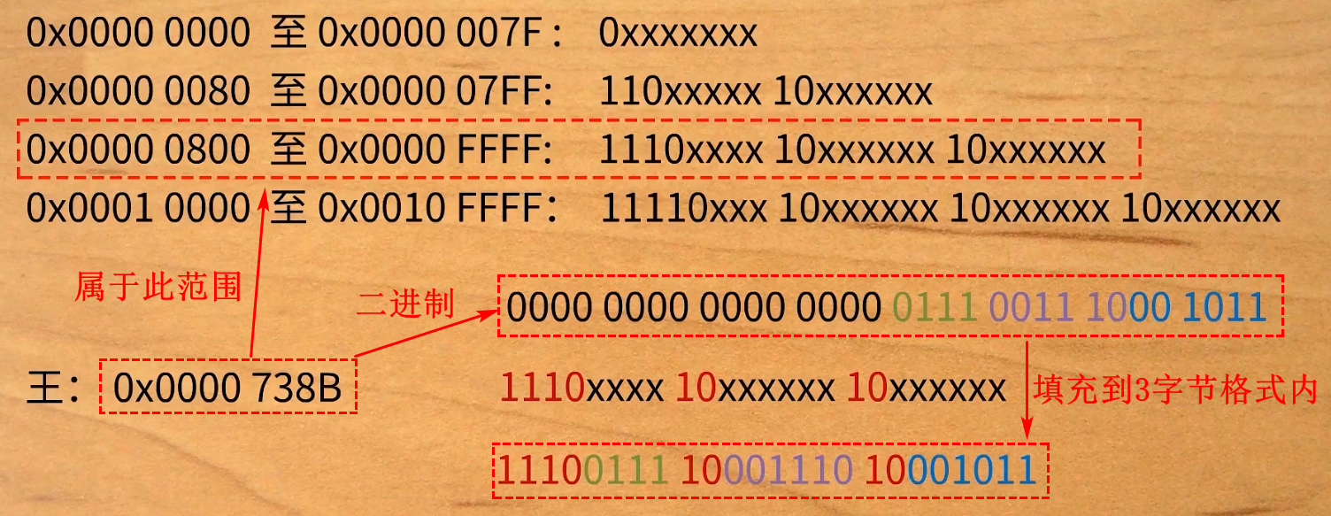 比如,王的Unicode编码:U+738B,属于3字节的UTF-8编码范围,将0x738B转换成2进制,填充到1110xxxx 10xxxxxx 10xxxxxx;
