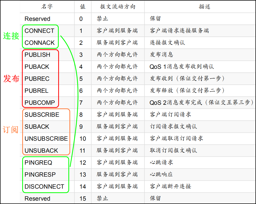 分类下你可以发现,其实控制报文的类型就三大类,连接、订阅、发布