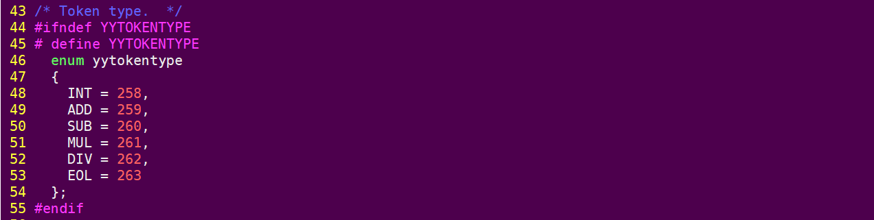 yylex()返回记号token标志,标志0-255被保留作为字符值,可以自己定义token标志的值,一般由bison产生的token标志默认从258开始。本例中,由bison生成的test_yacc.h文件,其中token枚举定义:
