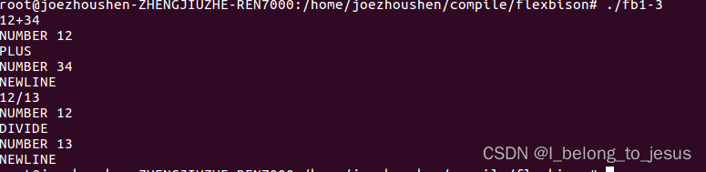 这里只给出了模式匹配,flex的lfl库提供了极小的主程序来调用词法分析器,这里已经足够,词法分析器的生成和编译与之前相同,生成可执行词法分析程序,执行后输入12+34和13/34做词法分析,执行结果如下: