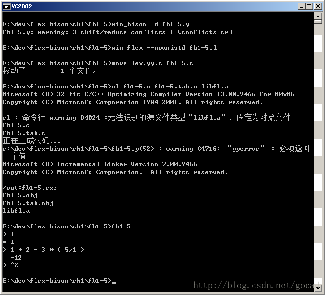 生成 fb1-5.exe ,由于用到 yywrap() 需要链接 flex 的 libfl.a 库。用VC编译的话,可以将 libfl.a 重名为libfl.lib 更直观。