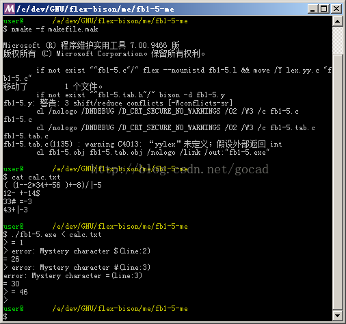 下面以 Win flex-bison 2.5.1和《flex & bison》第一章的简单计算器fb1-5为例,简单介绍如何使用。