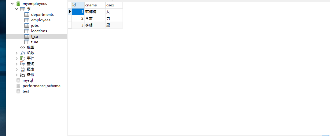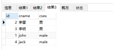 select id,cname,csex from t_ca where csex='男'