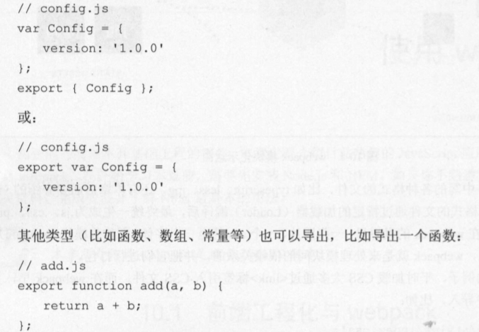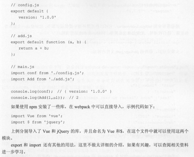 看起来很简单是吧?只有一个<div>节点,所有的代码都集成在了神奇的 main扣 文件中,理论 上古可以实现像知乎、淘宝这样大型的项目。 在开始讲解 webpack 的用法前,先介绍两个 ES6 中的语法 export 和 impo此, 因为在后面会大 量使用,如果对它不了解,可能会感到很困惑。 export 和 import 是用来导出和导入模块的。 一个模块就是一个js 文件,它拥有独立的作用域, 里面定义的变量外部是无法获取的。比如将一个配置文件作为模块导出,示例代码如下: