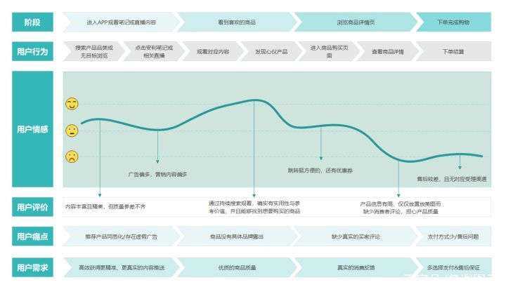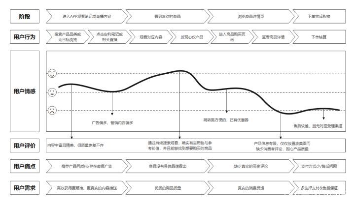 以下图为例,用户从观看内容到完成下单一共经历了四个阶段:进入APP观看笔记或直播内容、看到喜欢的商品、浏览商品详情页、下单完成购物。
