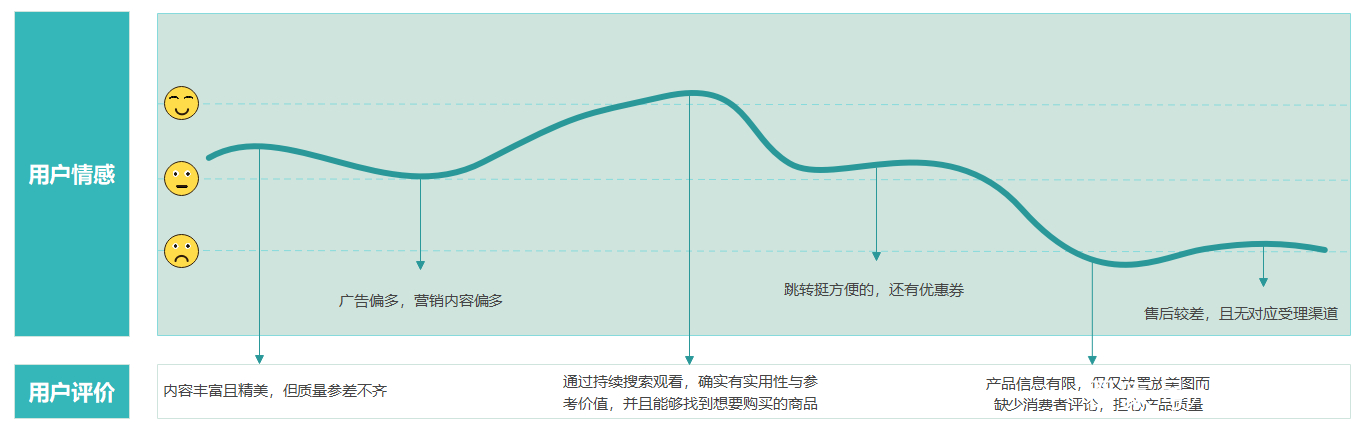 用户的情感曲线是用户使用体验的直观展现,从情绪变化可以对应到使用体验的好坏。用户体验旅程图的情绪曲线是根据对应阶段用户的使用感受而展现的情绪变化——形成曲线,情绪的低谷很可能反映了产品弊端或用户痛点。
