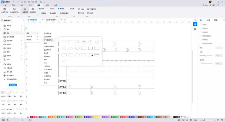在整张用户体验旅程图中,阶段、用户行为、情绪曲线、痛点与需求这几个部分用到非基础符号,这几个板块的符号可以在左侧按照:“商务-EPC图表形状”步骤调出。