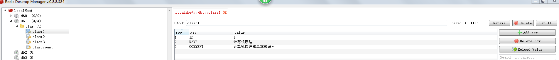 clas:id是一个List类型的Key-Value,记录了所有的课程ID,取出最后一个ID,再+1,作为增加的课程的ID,同时clas:count的值也要+1。使用addHash()方法向Redis添加了一个Hash类型的Key-Value(也就是一门课程):