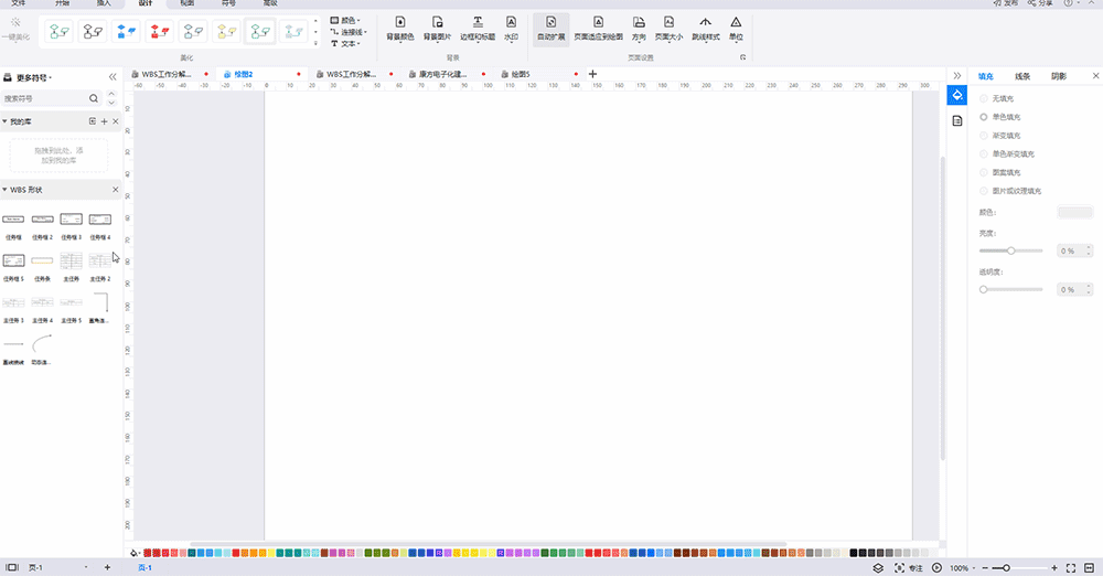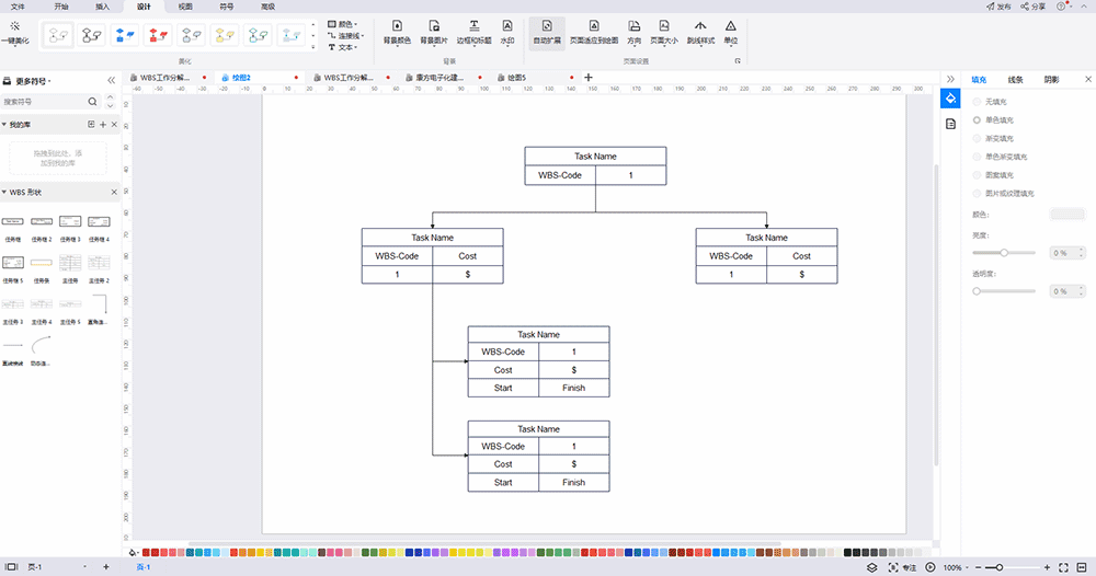 新建完成WBS画布即默认打开WBS相关符号(于左侧符号库),从左侧拖拽至画布即可,无需自己绘制,非常方便;在每项拆解的任务、工作之间添加连接线表示彼此间关系。