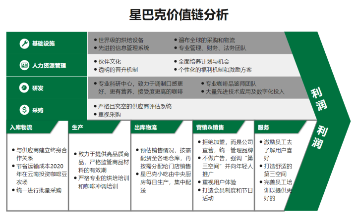 大家看下面这张星巴克价值链分析图表,对上述提到的9种活动就一目了然了(至于如何分析价值链,同样是基于这些价值活动进行开展的,这里不再赘述)。