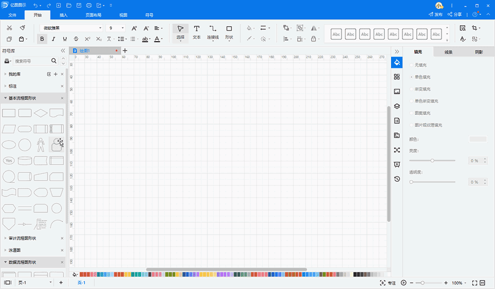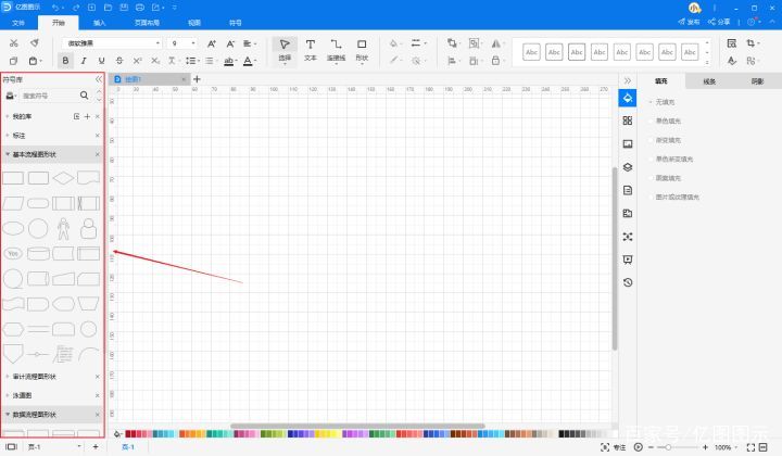 亿图图示内置的符号库就包括这一系列规范的流程图符号,其中包括但不限于基础流程图、数据流程图、泳道图(又称跨职能流程图)的符号。