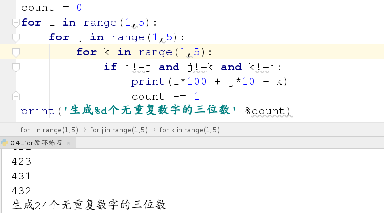 练习1:有1,2,3,4四个数字,求四个数字能生成多少个互不相同且无重复数字的三位数(不能含有122 133类似)
