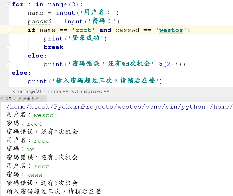 练习2:输入用户名和密码 ,判断是否正确(name = 'root', passwd = 'westos') ,登录仅有3次及会,超过3次,报错