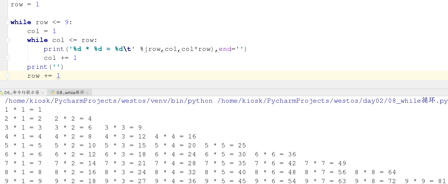 练习4:使用while循环打印九九乘法表