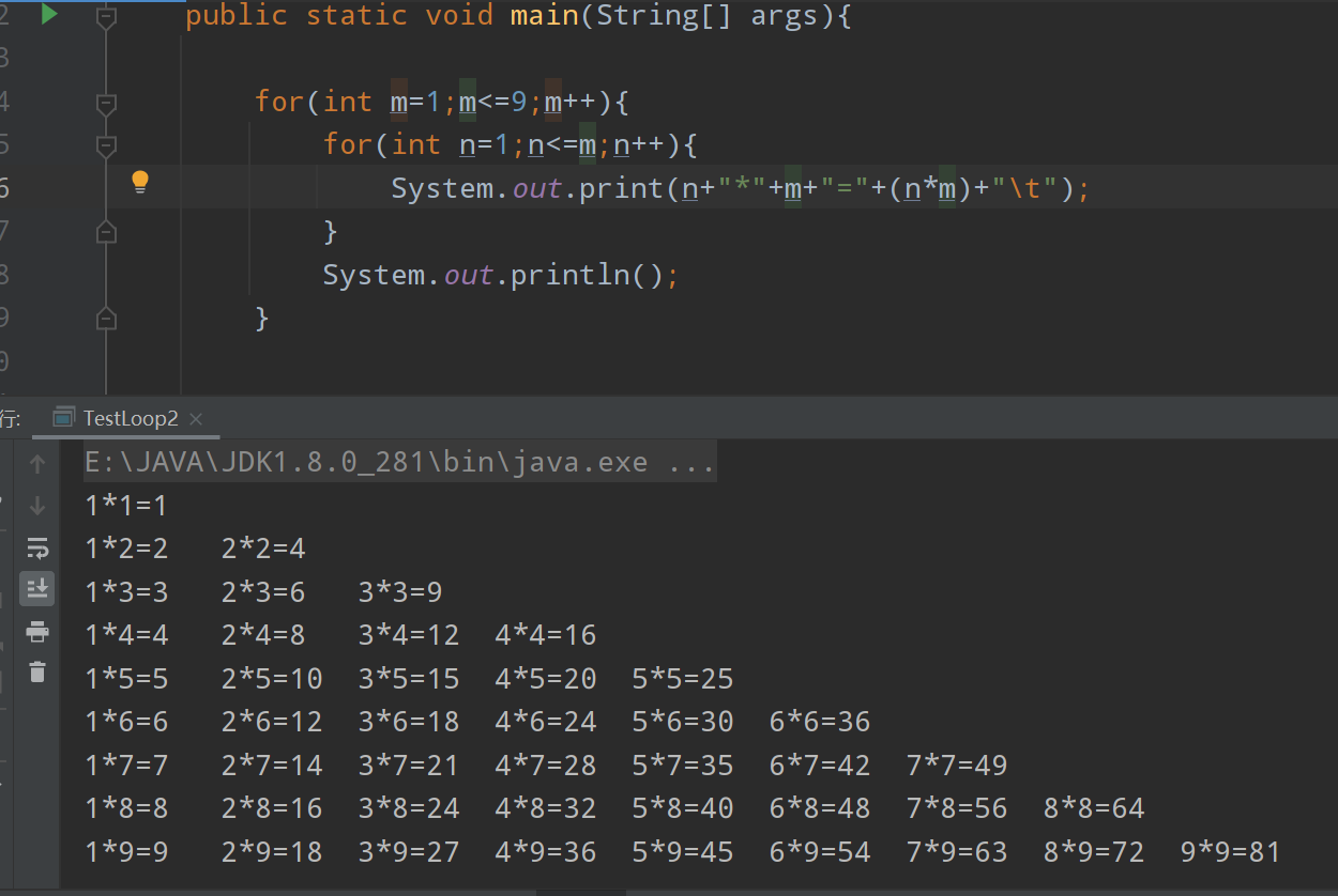 System.out.print(n+"*"+m+"="+(n*m)+"t");