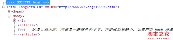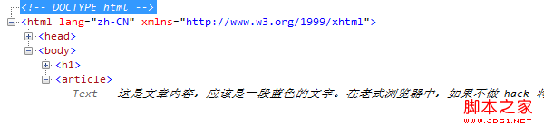 IE8 不能识别 article 标签, 定义在标签上的 CSS 样式没有起作用. 在 IE8 中, <article> 被解释成命名为 <article /> 和 </article /> 两个空的标签元素, 与文章内容并列为兄弟节点, 如下图.
