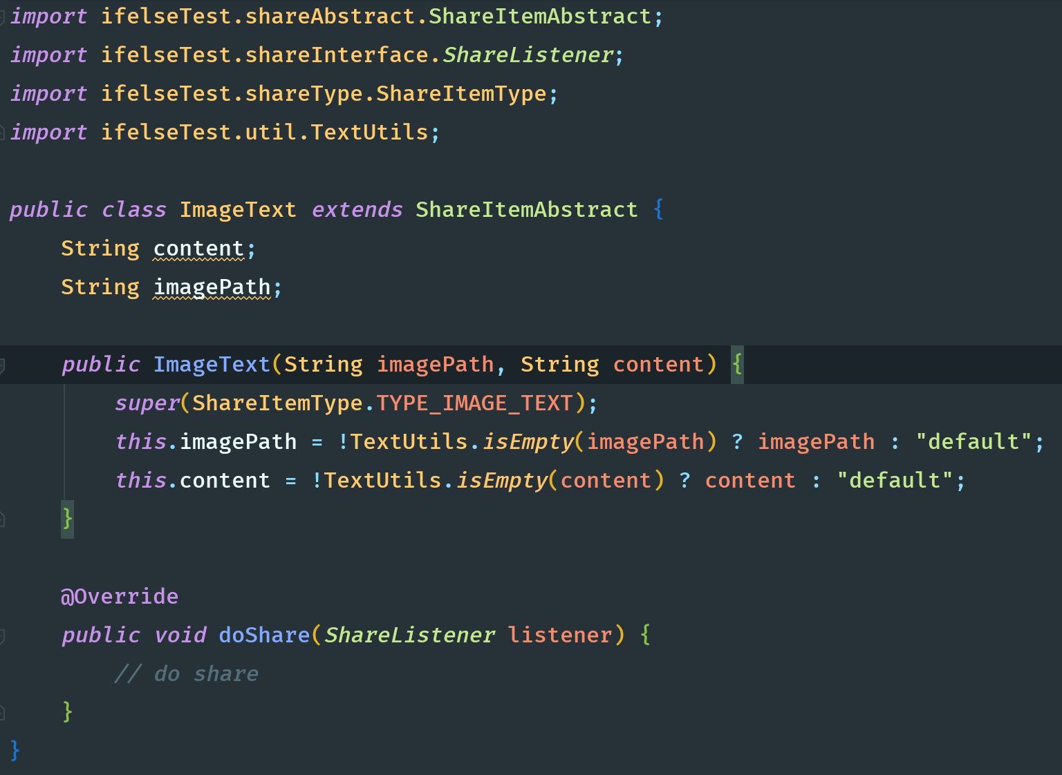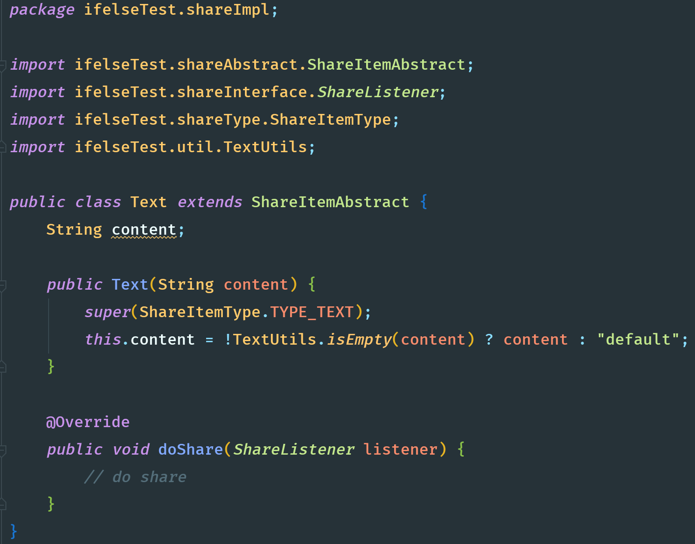 1 public abstract class ShareItem { 2 int type; 3 4 public ShareItem(int type) { 5 this.type = type; 6 } 7 8 public abstract void doShare(ShareListener listener); 9 } 10 11 public class Link extends ShareItem { 12 String title; 13 String content; 14 String link; 15 16 public Link(String link, String title, String content) { 17 super(TYPE_LINK); 18 this.link = !TextUtils.isEmpty(link) ? link : "default"; 19 this.title = !TextUtils.isEmpty(title) ? title : "default"; 20 this.content = !TextUtils.isEmpty(content) ? content : "default"; 21 } 22 23 @Override 24 public void doShare(ShareListener listener) { 25 // do share 26 } 27 } 28 29 public class Image extends ShareItem { 30 String imagePath; 31 32 public Image(String imagePath) { 33 super(TYPE_IMAGE); 34 this.imagePath = !TextUtils.isEmpty(imagePath) ? imagePath : "default"; 35 } 36 37 @Override 38 public void doShare(ShareListener listener) { 39 // do share 40 } 41 } 42 43 public class Text extends ShareItem { 44 String content; 45 46 public Text(String content) { 47 super(TYPE_TEXT); 48 this.content = !TextUtils.isEmpty(content) ? content : "default"; 49 } 50 51 @Override 52 public void doShare(ShareListener listener) { 53 // do share 54 } 55 } 56 57 public class ImageText extends ShareItem { 58 String content; 59 String imagePath; 60 61 public ImageText(String imagePath, String content) { 62 super(TYPE_IMAGE_TEXT); 63 this.imagePath = !TextUtils.isEmpty(imagePath) ? imagePath : "default"; 64 this.content = !TextUtils.isEmpty(content) ? content : "default"; 65 } 66 67 @Override 68 public void doShare(ShareListener listener) { 69 // do share 70 } 71 }