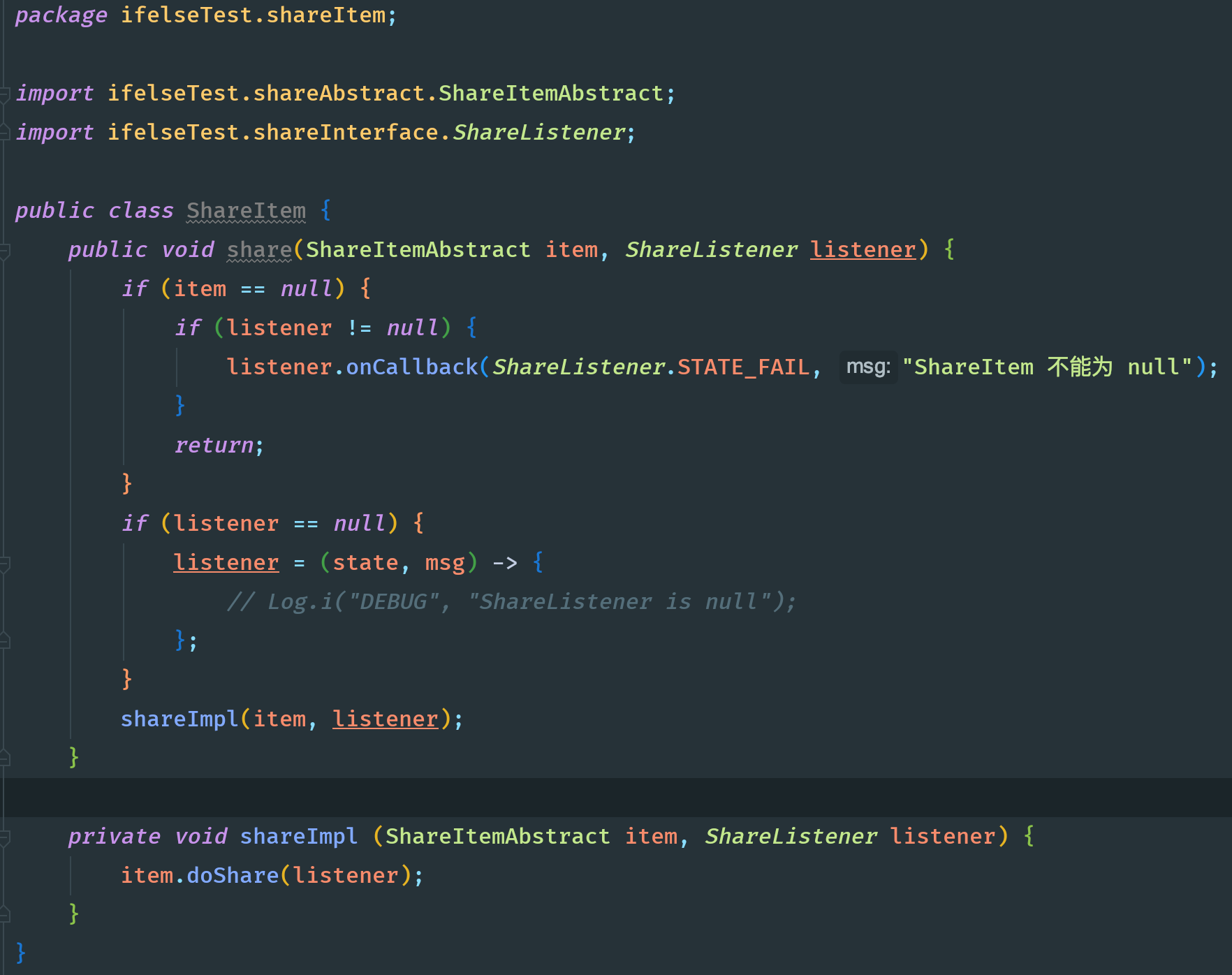 可以看到,上面的代码分为外部接口share和内部接口shareImpl,ShareItem和ShareListener的判断都放在share里完成,那么shareImpl就减少了if else的嵌套了,相当于把if else分摊了。这样一来,代码的可读性好很多,嵌套也不超过3层了。