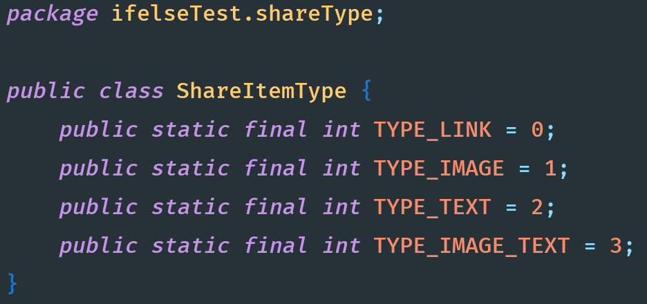 1 private static final int TYPE_LINK = 0; 2 private static final int TYPE_IMAGE = 1; 3 private static final int TYPE_TEXT = 2; 4 private static final int TYPE_IMAGE_TEXT = 3; 5 6 public class ShareItem { 7 int type; 8 String title; 9 String content; 10 String imagePath; 11 String link; 12 } 13 14 public interface ShareListener { 15 16 int STATE_SUCC = 0; 17 int STATE_FAIL = 1; 18 19 void onCallback(int state, String msg); 20 }